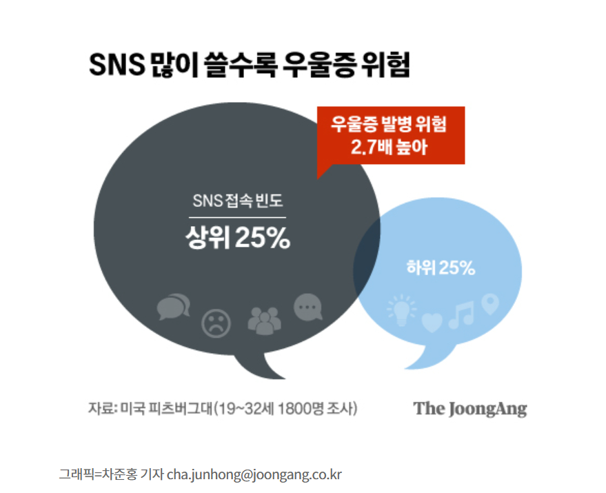▲ SNS 사용빈도와 우울증의 연관성. ©중앙일보