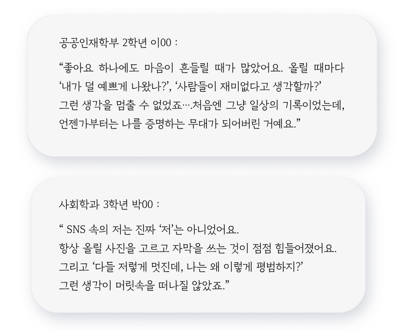 ▲ SNS에서 느끼는 불안과 부정적인 감정을 호소하는 재학생.