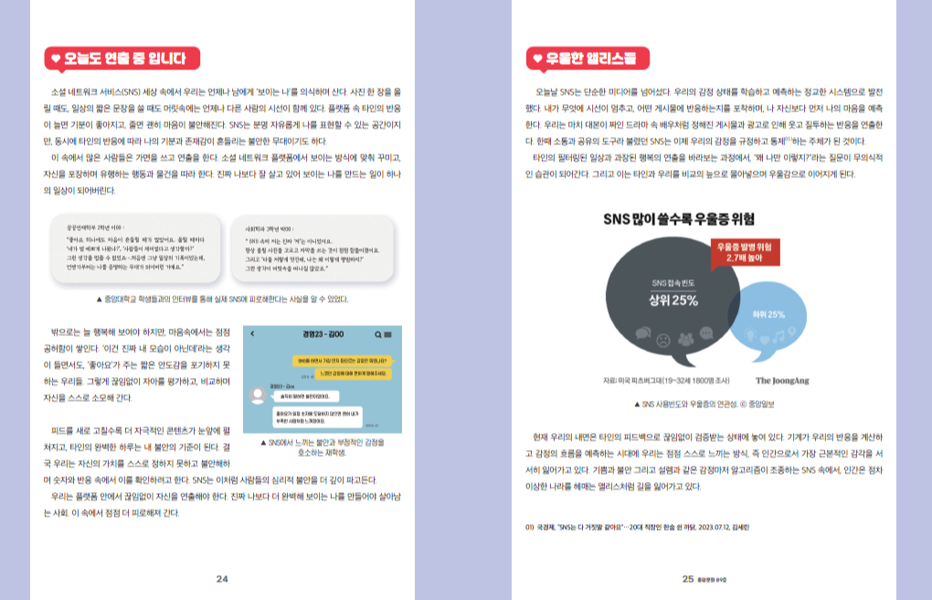 피드를 새로 고칠수록 더 자극적인 콘텐츠가 눈앞에 펼쳐지고, 타인의 완벽한 하루는 내 불안의 기준이 된다. 결국 우리는 자신의 가치를 스스로 정하지 못하고 불안해하며 숫자와 반응 속에서 이를 확인하려고 한다. SNS는 이처럼 사람들의 심리적 불안을 더 깊이 파고든다.
