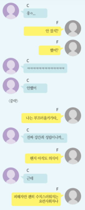 사건 이후 C는 동아리 구성원 중 꽤 친밀하다고 생각했던 E와 카카오톡을 통해 대화를 나눴다. C는 가해자 D가 자신에게 술을 먹였으며, 함께 모텔에 간 뒤 예상치 못한 신체접촉이 이루어졌다고 말했다. 그러나 D가 자신의 선을 넘어 앞으로 경계해야 한다고 말하는 C에게 E는 “와 나도 써먹어야지”라고 말하며 장난스러운 반응을 보였다. 사회에 만연한 강간문화가 드러나는 지점이다. 상대에게 술을 먹인 뒤 신체접촉을 하는 행위는 개인의 성적자기결정권을 침해할 수 있다. 그러나 E는 성폭력으로 이어질 수 있는 문제적인 행위를 연애로 나아가기 위한 수단 정도로 치환해버렸다. 성폭력 자체, 혹은 성폭력 시도를 강간이 아닌 연애를 위한 단계나 수단으로 인지하는 문화는 성폭력의 심각성을 덮고, 가해자에게 면죄부를 준다. 이와 같은 인식은 성폭력을 성폭력으로 인지하는 것을 어렵게 하며, 강간문화를 지속시킨다.
