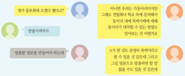 위 자료는 피해자 A가 동아리 단톡방에서 몇 차례 폭언한 이후 동아리 임원들이 임원 카톡방에서 A의 동아리 방출에 대해 나눈 대화다. 동아리 임원들은 A의 폭언에 강경하게 대응하려 하고 있다. 처음으로 구성원들에게 폭언했을 당시 A는 성폭력으로 인한 정신적 피해로 병원에 입원한 상태였다. 그런 A에게 필요한 것은 아픔에 대한 동아리 구성원들의 공감과 위로였다. 그러나 동아리 구성원들은 A에게 무관심했다. 또한 동아리 임원은 A에게 폭언을 이유로 동아리 행사에 불참할 것을 권유했다. 이후 서운함을 느낀 A는 몇 차례 폭언하고 부고 소동을 일으키게 된 것이다. 즉, 동아리 임원들은 A가 이러한 행동을 하게 된 배경은 전혀 고려하지 않고 있다. 그뿐만 아니라 동아리 임원들은 전체 구성원에게 동아리 활동의 잠정 중단을 알리는 과정에서 성폭력 사건을 ‘남녀 간의 불미스러운 일’로 표현했다. 성폭력 사건을 사적인 사건으로 축소하는 것은 사건의 심각하게 받아들이지 않는 것과 같다. 피해자에 대한 공감의 부재와 성폭력 사건 축소는 성폭력 사건의 올바른 해결과 성폭력 예방을 불가능하게 한다. 이러한 악순환은 집단 내 강간문화를 지속시킨다.