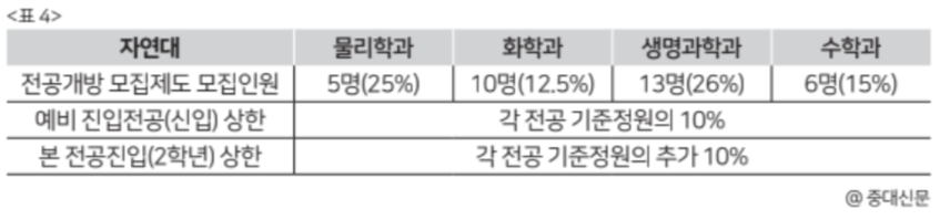 자연대는 학과별로 다른 비율을 적용하여 전공개방제도 모집안을 작성했다. 이인구 자연대 학생회장에 따르면 자연대에서는 학과들의 특성과 정원수를 반영하여 비율을 산정했다고 밝혔다.