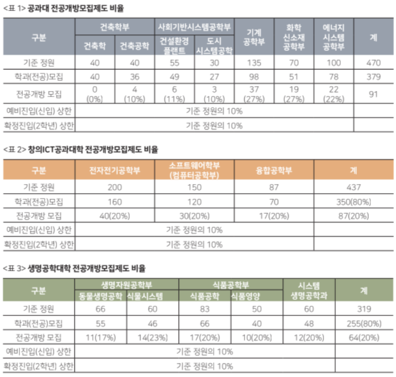 11월 14일 교무위원회에서 자연대의 전공개방 모집제도 계획안이 발표됐다. 신입생을 모집할 때 각 학과는 제도를 통해 학과별 기준정원의 10%를 추가로 선발할 수 있다. 또한 입학생들이 2학년이 되어 본 전공을 선택할 때도 각 학과는 기준 정원의 10%를 추가적으로 수용할 수 있다.