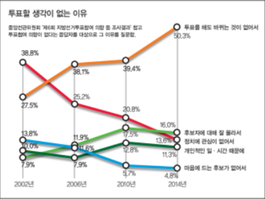 선거관리위원회의 2014년 조사에 따르면, 투표할 생각이 없는 응답자 중 50.3%가량이 ‘투표를해도 바뀌는 것이 없어서’라고 답변했다. 정치에 대한 낮은 효능감은 정치적 무관심으로 표출될 뿐만 아니라, 정치 혐오라는 감정으로 연결되곤 한다. 정치에 대한 무력감은 정치 전반에 대한 부정적인 인식으로 이어지기 때문이다. 내가 요구하는 것들이 실제 정책으로 반영되지 않는 순간, ‘정치는 아무것도 해결해주지 않는다’, ‘정치는 단지 분열감을 조장할 뿐이다’ 등의 사고로 이어지며 정치에 대한 환멸감과 혐오의 감정을 불러온다.