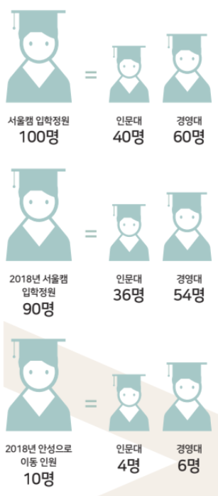 기준 면적이 가장 넓은 공과대학의 인원을 안성캠으로 이전할 경우 서울캠 인원 모집에서 최소 인원(108명)을 감축하게 된다. 인문사회계열 이동시 179명이 이동하게 된다. 11월 2일 기획처가 발표한 캠퍼스 간 정원 조정 계획 수립(안)에 따르면 본부는 올해 말까지 정원이동 방안에 대해 논의하고, 내년 2월 중으로 이와 관련한 학칙 개정을 진행할 예정이다.