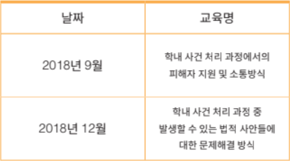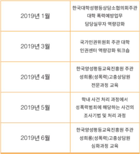 제2조 제3항 '센터는 전문연구원의 성희롱·성폭력을 포함한 인권침해 관련 상담 및 업무 역량강화를 위하여 교육 훈련을 지원할 수 있다.'는 규정에 근거해 이루어진다. 이에 따라 국가인권위원회, 성폭력상담소전국협의회 등에서 1년에 3~4번 개최하는 워크숍과 수퍼비전을 통해 전문연구원 교육이 진행되고 있다. 수퍼비전의 경우 보통 한 학기에 한 번씩 이루어진다. 2 케이스 스터디도 진행되는데 이는 구체적인 사례를 가지고 연구하는 것을 말한다. 성폭력 사건은 사건마다 특징이 다르기 때문에 수사 역량 강화를 위해서라도 케이스 스터디는 자주 진행될 필요가 있다. 하지만 김경희 인권센터장이 역임한 2017년 9월 이후 현재까지 1번 이루어졌다. 그 결과 작년 9월부터 올해 6월까지 전문연구원을 대상으로 한 교육은 케이스스터디를 제외하고 7번 이루어졌다. 전문성이 부족한 전문연구원의 역량을 강화하기 위해 한 달에 한 번꼴의 교육이 충분한지 의문이다.