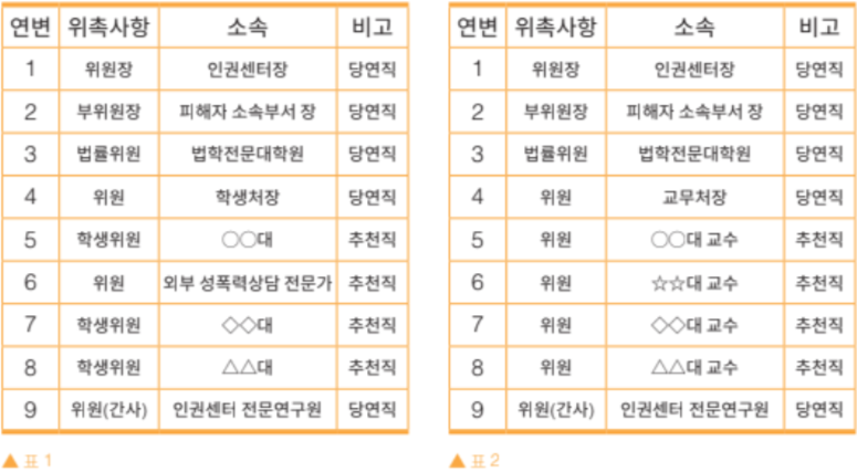 하지만 현재 규정은 여전히 교수로 구성이 치중되어 있다. 대책위가 <표1>과 같이 구성됐 다고 가정해보자. <표1>은 교수가 가장 적게 참여하는 방향으로 구성했다. 학생이 신고자라 가정하고 학생대표 2인을 대책위원으로 참여시켰다. 외부 전문가도 포함했다. 그렇다 해도 당연직 위원은 모두 교수이다. <표2>는 신고인이 학생이 아닌 경우로 학생위원을 필수로 참여시키지 않아도 된다. 추천직 위원을 모두 교수로 구성해도 문제가 없는 만큼 최대한 교 수로 구성해 보았다. 9명 중 전문연구원을 뺀 8명이 교수다. 대책위 구성이 교수라는 특정 집단 위주로 이루어진다면 이뤄진다면 피신고인이 교수인 경우 '제 식구 감싸기'가 충분히 우려된다.