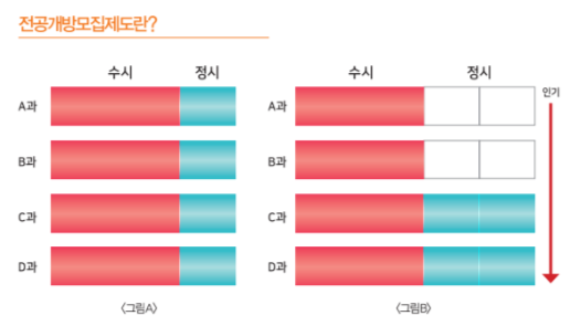 전공개방모집제도는 학과의 정원을 늘리는 제도다. 위의 그림 A는 기존의 학과제다. 정시와 수시를 모두 학과 단위로 뽑는다. 그림 B는 전공개방모집제도를 도식화한 것이다. 이 제도는 정시 인원을 단과대별로 뽑는다. 단과대별로 뽑은 정시 인원을 늘어난 학과 정원에 채우는 제도다. 정원은 확대했으나 정시로 모집하는 학생의 수는 변화가 없다. 여기에 전공개방모집제도의 목적과 본질이 있다. 늘어난 정원에 기존과 같은 수의 학생으로 채우면 반드시 공백이 생긴다. 작은 컵에 가득 차 있던 물을 큰 컵으로 옮겼을 때 중력 때문에 아래부터 물이 가득 차고 위에는 공백이 생긴다. 이 제도에도 중력과 유사한 인기라는 힘이 작용한다. 정원이라는 컵의 용량을 늘려 인기라는 중력에 의해 인기학과로 학생들이 쏠리게 만드는 제도, 이것이 전공개방모집제도다.