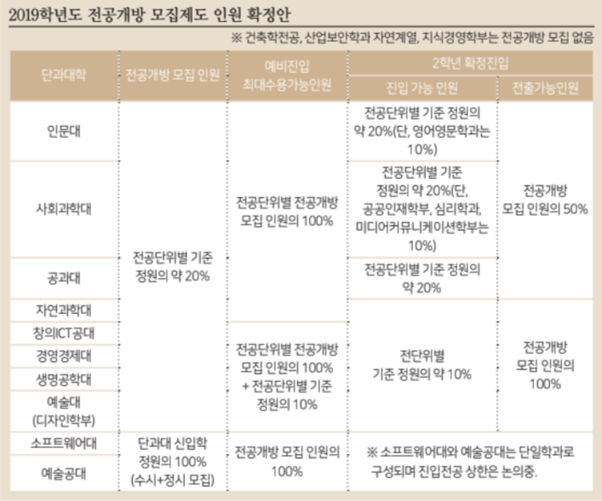- 전공개방모집인원을 10%로 줄이는 안이다. 19학년도에는 받아들여지지 않았지만 2020학년도부터는 받아들여진다. [본문으로]