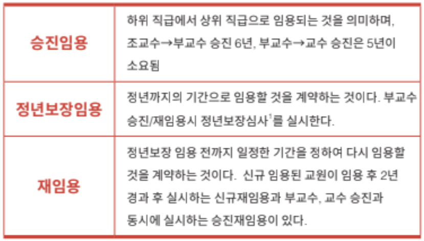 - 교원임용규정 제18조1항 "본교의 교원은 소정의 교원업적이 객관적으로 평가되고, 교원으로서 자질이 인정되는 경우에 다음 각 호의 범위 내에서 임용조건을 정하여 재임용할 수 있다." 3. 부교수 : 5년 [본문으로]