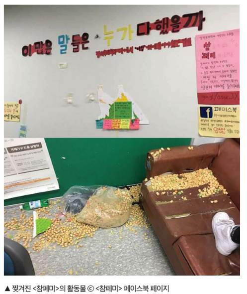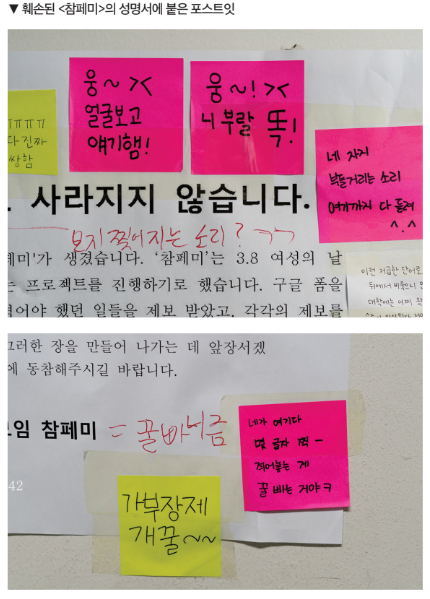 도 하듯 대량의 과자가 뿌려져 있었다. 사건 이후 한 달도 채 지나지 않아 법학관 지하 1층에 배부된 여성주의 교지 <녹지> 40여 권이 쓰레기통에 버려진 채 발견되었다. 다른 간행물들은 그대로인데 <녹지>만 버려졌다는 점, CCTV 확인 결과 범행을 저지른 남성들이 범행을 위해 만났다가 곧바로 헤어졌다는 점을 고려했을 때 이는 우발적인 장난이 아닌 <녹지>를 겨냥한 명백한 계획 범행이었다. 테러는 여기서 끝나지 않았다. 약 3주 후, <참페미>의 활동물 훼손 사건 이후 게시된 두 개의 성명서, “여성의 목소리는 찢어도 사라지지 않습니다”와 “우리는 찢겨진 자리에서 다시 시작하겠습니다”가 또다시 훼손되었다. “보지 찢어지는 소리?”, “꿀빠니즘”등의 저열한 비난이 빨간 글씨로 적혀있었다. 억압당해 온 여성의 목소리를 가시화시키려는 움직임을 무참히 짓밟는 테러가 학내에서 연이어 발생했다.