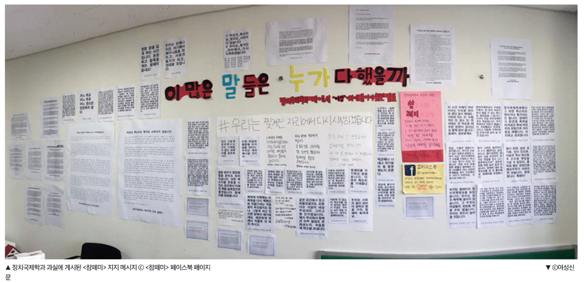 변한 것 없는 세상 속에서 유일하게 변한 것은 ‘우리’였다. 우리는 일련의 폭력적인 사건들을 목도하며 절망만 하고 있지는 않았다. “여성의 목소리는 찢어도 사라지지 않습니다. 우리는 찢겨진 자리에서 다시 시작하겠습니다”라는 <참페미>의 성명서를 시작으로 학내·외를 가리지 않고 여러 단위들에서 <참페미>에 지지와 연대의 성명서를 보내왔다. 연대 성명서를 포함한 수많은 지지 메시지들이 다시금 정치국제학과 과실의 벽면을 빼곡히 메웠다. 여성의 목소리가 무참히 뜯겨나간 자리를 또 다른 여성들의 목소리가 채웠다. 두 번째 성명서 훼손 사건 이후에는 훼손된 성명서 주변에 범행을 저지른 남성을 비난하는 십여 개의 포스트잇이 붙었다. 작년 5월 17일 이후 강남역 10번 출구 앞에 붙은 셀 수 없이 많은 포스트잇들이 떠오르는 순간이었다.