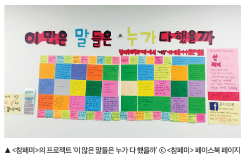 올해만큼 학내에 만연했던 여성 혐오가 적나라하게 드러난 적은 없었다. 정치국제학과 내 여성주의 소모임 <참페미>는 ‘이 많은 말들은 누가 다 했을까’라는 프로젝트의 일환으로 학과 내에서 여학생들이 여성이라는 이유로 겪어야 했던 성차별적인 언행을 제보 받아 과실 벽에 부착했다. 학과 내에서 성적으로 대상화 되었던 일, 성희롱을 당하고도 그것이 당연한 분위기 속에서 문제제기를 할 수 없었던 일, 일상적으로 들어왔던 혐오 발언들에 대한 고발이 봇물 터지듯 쏟아져 나왔다. 그러나 불과 나흘 만에 활동물은 흔적도 없이 사라졌다. 종이가 찢긴 자리에는 여성들의 경험과 목소리를 비웃기라