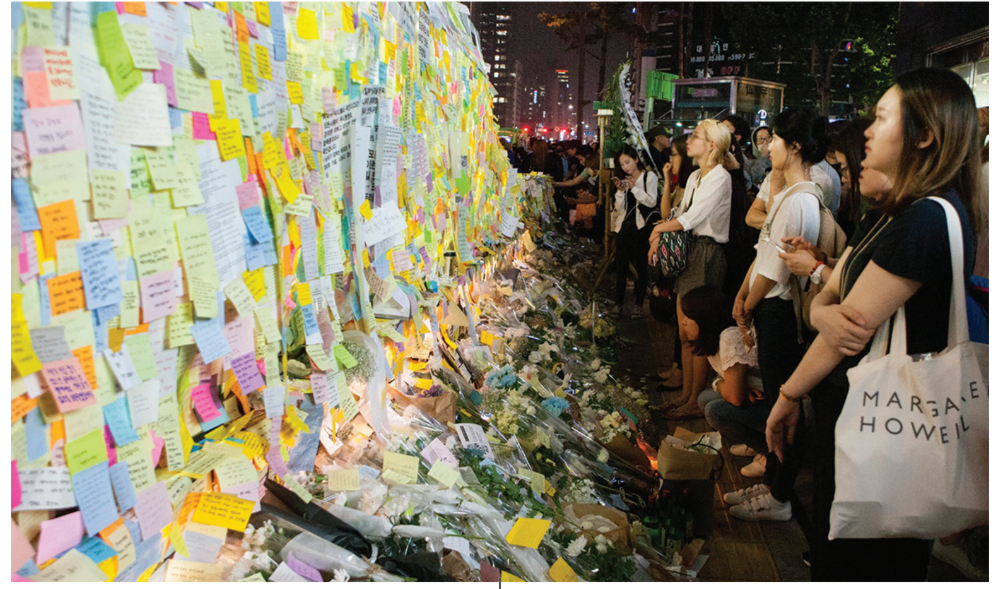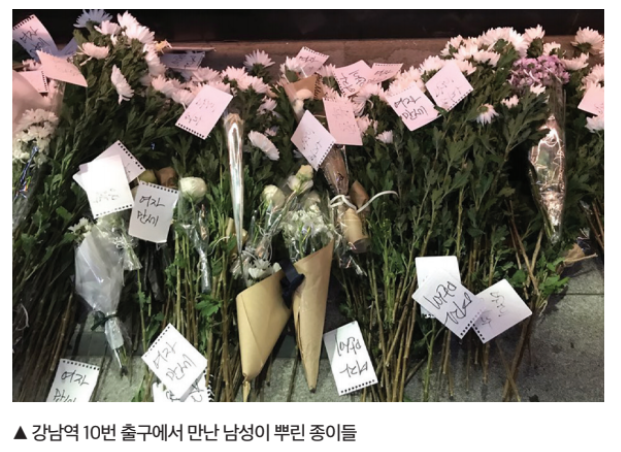 강남역 살인사건이 1주기를 맞이한 5월 17일의 밤이었다. 늦게까지 진행된 회의를 마치고 헌화를 하러 강남역 10번 출구로 향했다. 한참 전부터 그곳을 찾아야겠다고 다짐했음에도 막상 가기까지 꽤 오래 망설였다. 헌화하는 사람을 몰래 찍는 사람들을 봤다거나 헌화를 하다 조롱 섞인 비아냥을 들었다는 제보가 무성했기 때문이다. 그러나 먼발치에서부터 똑똑히 보이던 수북한 국화꽃들을 눈앞에 마주한 순간, 모든 공포와 두려움은 눈 녹듯 사라졌다. 여성이라는 이유로 온갖 차별과 폭력을 겪어야 했던 나, 그리고 나를 비롯한 수많은 여성들에게 꽃들이 말해주고 있는 듯했다. 너는 혼자가 아니라고. 말로 형용할 수 없는 안도감과 든든함을 느끼며 꽃을 내려놓으려던 그때, 나는 변하지 않은 한국사회의 단면을 또다시 마주해야 했다.