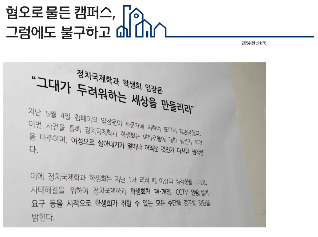 변한 것 없는 세상 속에서 유일하게 변한 것은 ‘우리’였다. 우리는 일련의 폭력적인 사건들을 목도하며 절망만 하고 있지는 않았다. “여성의 목소리는 찢어도 사라지지 않습니다. 우리는 찢겨진 자리에서 다시 시작하겠습니다”라는 <참페미>의 성명서를 시작으로 학내·외를 가리지 않고 여러 단위들에서 <참페미>에 지지와 연대의 성명서를 보내왔다. 연대 성명서를 포함한 수많은 지지 메시지들이 다시금 정치국제학과 과실의 벽면을 빼곡히 메웠다. 여성의 목소리가 무참히 뜯겨나간 자리를 또 다른 여성들의 목소리가 채웠다. 두 번째 성명서 훼손 사건 이후에는 훼손된 성명서 주변에 범행을 저지른 남성을 비난하는 십여 개의 포스트잇이 붙었다. 작년 5월 17일 이후 강남역 10번 출구 앞에 붙은 셀 수 없이 많은 포스트잇들이 떠오르는 순간이었다.