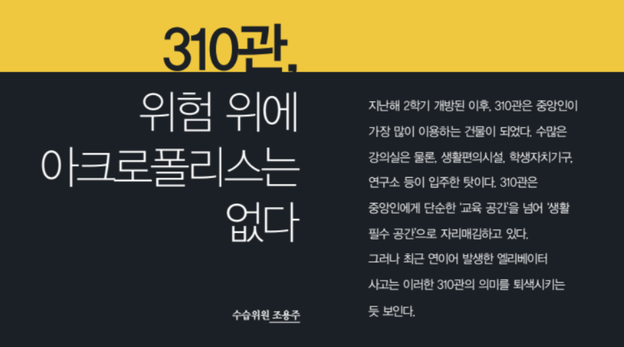 지난해 2학기 개방된 이후, 310관은 중앙인이 가장 많이 이용하는 건물이 되었다. 수많은 강의실은 물론, 생활편의시설, 학생자치기구, 연구소 등이 입주한 탓이다. 310관은 중앙인에게 단순한 ‘교육 공간’을 넘어 ‘생활 필수 공간’으로 자리매김하고 있다. 그러나 최근 연이어 발생한 엘리베이터 사고는 이러한 310관의 의미를 퇴색시키는 듯 보인다.