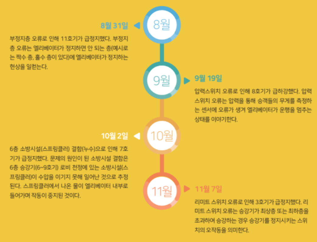 시설팀은 8월 31일, 9월 19일 사고의 원인에 대해 8호기와 11호기의 과부하 값 초과 설정 때문 이라고 설명한다. 이때 ‘과부하 값’은 엘리베이터가 정격하중을 초과했을 시 문을 닫지 않고 사람이 내릴 때까지 운행을 멈추도록 설정된 기준 값을 의미하며, ‘정격하중’은 승강기 내에 정상적으로 실을 수 있는 최대 하중을 뜻한다.