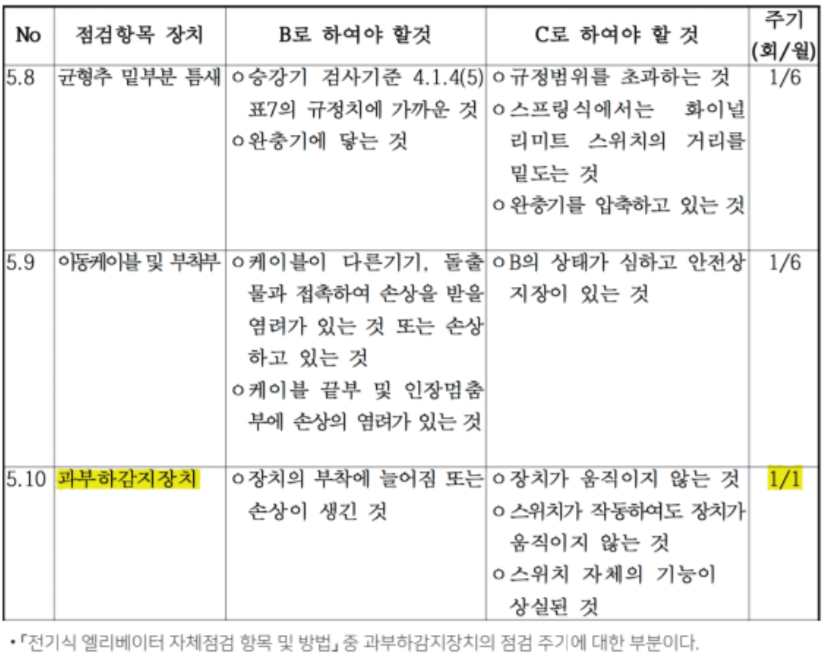 그러나 한국승강기안전공단의 설명은 달랐다. 한국승강기안전공단 관계자는 “과부하감지장치는 월 1회 이상 점검이 원칙”이라며 “15년을 주기로 검사하는 엘리베이터 부품은 존재하지 않는다. 엘리베이터의 그 어떤 부품도 검사주기가 1년이 넘어가지 않기 때문”이라 설명했다. 한국승강기안전공단에서 제공하는 「전기식 엘리베이터 자체점검 항목 및 방법」 문서에도 해당 사항이 명시되어 있다.