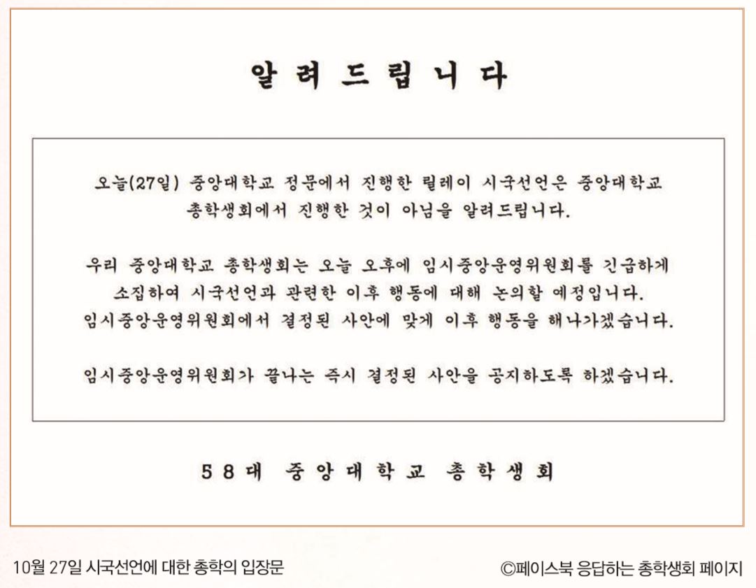 총학생회장은 이런 비판에 어느 정도 수긍한다며 “일단 준비된 시국선언을 해야 하는 건 맞지만, 중앙대도 주요 대학 중 하나인 만큼 서둘러 언론에 힘을 실어줘야 했었다”고 당시 정황을 설명했다.