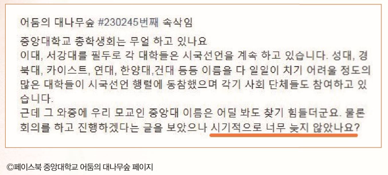 총학생회장은 이런 비판에 어느 정도 수긍한다며 “일단 준비된 시국선언을 해야 하는 건 맞지만, 중앙대도 주요 대학 중 하나인 만큼 서둘러 언론에 힘을 실어줘야 했었다”고 당시 정황을 설명했다.
