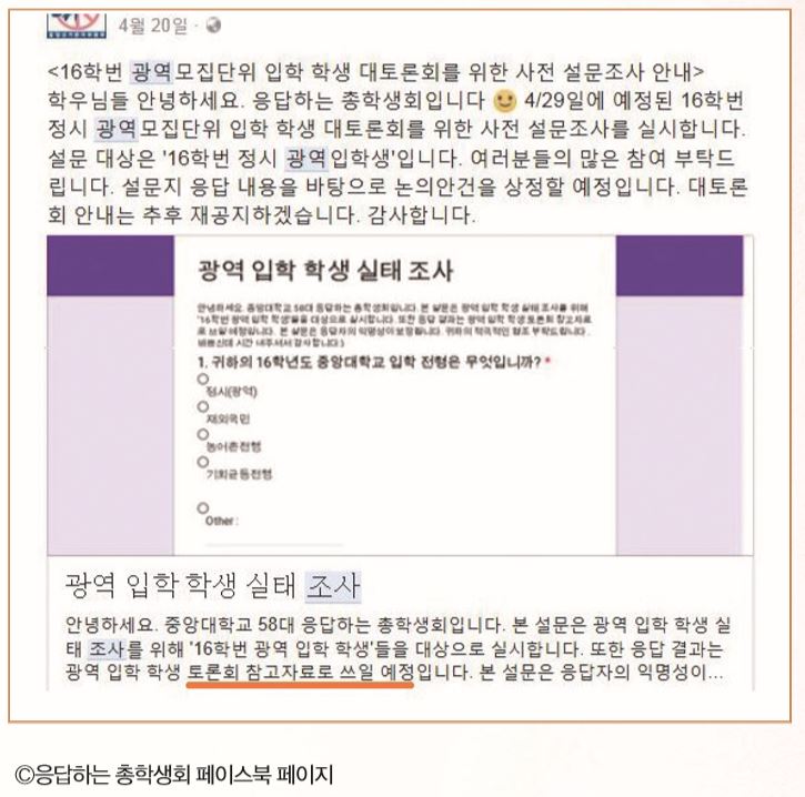 ‘응답’한다는 이름에 걸맞게 구성원들의 목소리에 귀 기울이는 듯한 총학의 모습을 자주 목도할 수 있었다. 중앙대가 올해 입시에서 시행한 정시 광역모집은 본부의 독단적인 태도와 부족한 계획으로 인해 많은 문제를 낳고 있었다. 그런 와중에 당선이 된 이들은 임기를 시작함과 동시에 광역화 대응에 착수했다. 광역모집 실태조사와 대토론회를 진행했다. 1학기 전체학생대표자회의에선 광역모집 폐지 요구 안건을 상정하기도 했다.