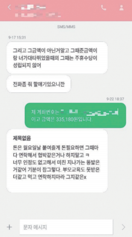 그러자 다시 사장은 억지를 부리기 시작했다. 한참 논쟁 후에 15만 원, 또 한참 논쟁 후 20만 원, 또 논쟁 후 30만 원을 주겠다고 했다. 그때마다 감독관은 그 금액에 합의할 것을 권유했다. 사장이 괘씸하기도 했지만 내가 원래 받아야 할 금액을 굳이 포기할 필요가 없다는 생각에, 33만 원 전액을 고수했다. 전액을 지급하지 않으면 고소하겠다고 으름장을 놓았다. 한 시간여 간의 지난한 논쟁 끝에 사장은 전액을 지급하기로 약속했다. 마지막으로 내게 욕 문자를 남기는 것도 잊지 않았다.
