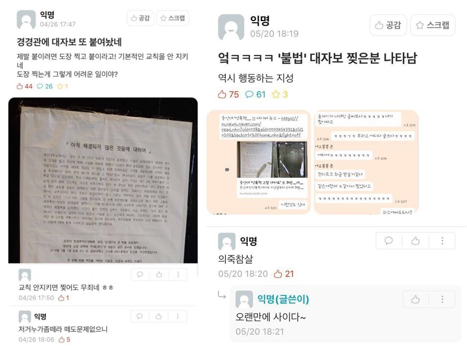 학교 본부로부터의 검열이 ‘권력과의 불화’라는 수직적 관계에서 이해된다면, 학내 구성원 간의 대자보 훼손은 ‘공론장 내의 불화’라는 수평적 관계에서 이루어진다.