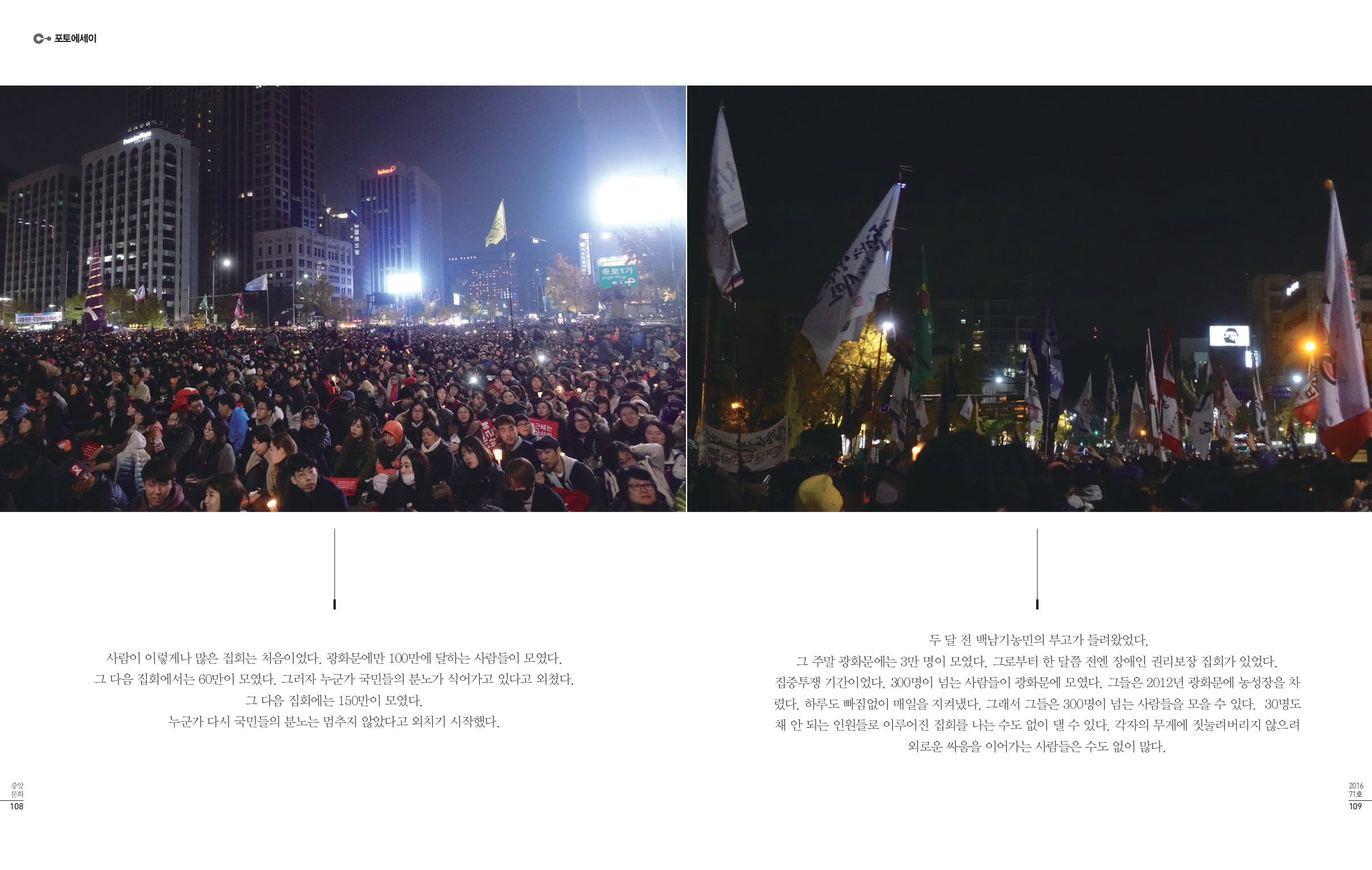 두 달 전 백남기농민의 부고소식이 들려왔었다. 그 주말 광화문에는 3만명이 모였다. 그로부터 한 달쯤 전엔 장애인 권리보장 집회가 있었다. 집중투쟁 기간이었다. 300명이 넘는 사람들이 광화문에 모였다. 그들은 2012년 광화문에 농성장을 차렸다. 하루도 빠짐없이 매일을 지켜냈다. 그래서 그들은 300명이 넘는 사람들을 모을 수 있다.