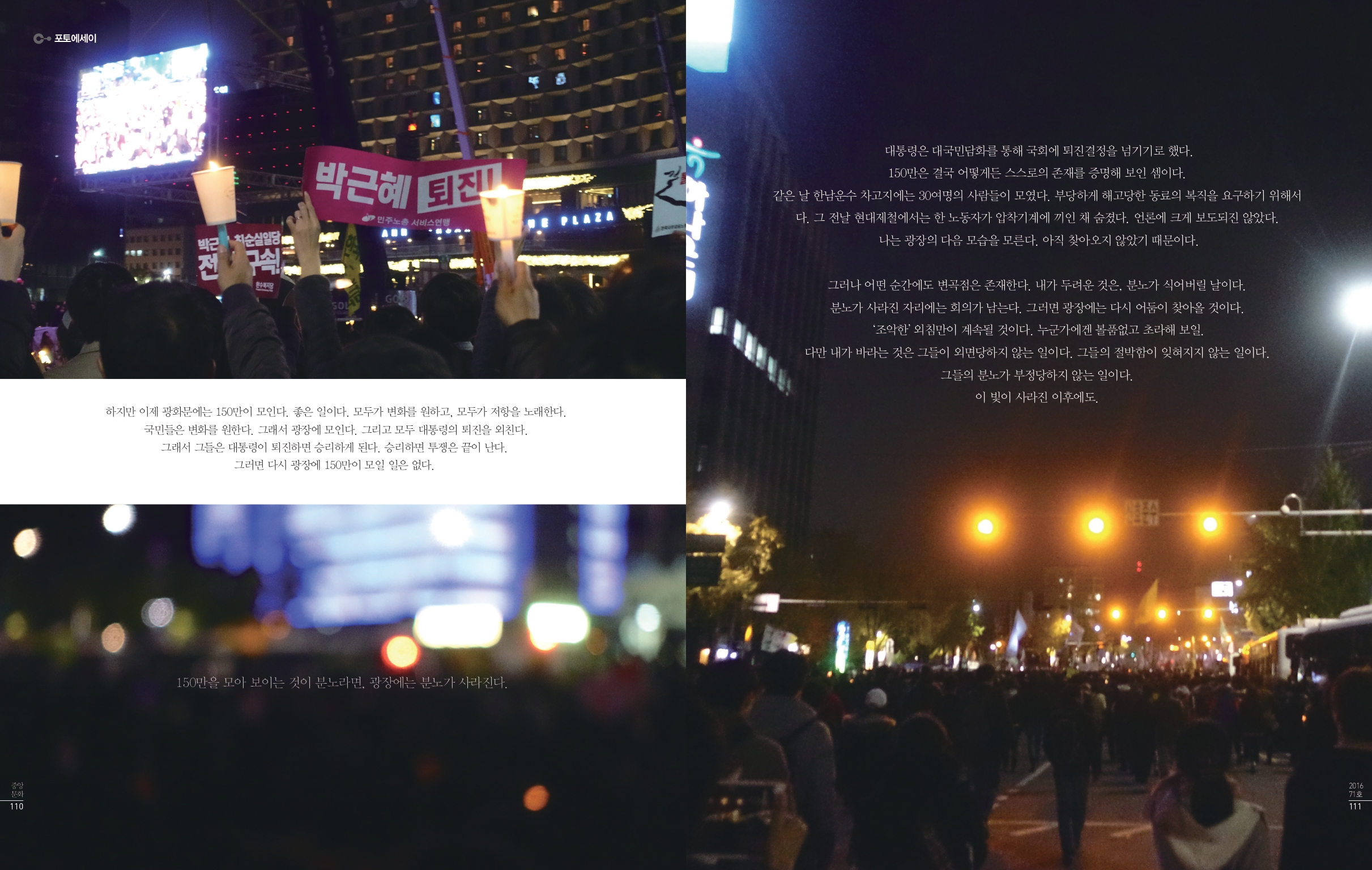 사람이 이렇게나 많은 집회는 처음이었다. 광화문에만 100만에 달하는 사람들이 모였다. 그 다음 집회에서는 60만이 모였다. 그러자 누군가 국민들의 분노가 식어가고 있다고 외쳤다. 그 다음 집회에는 150만이 모였다. 누군가 다시 국민들의 분노는 멈추지 않았다고 외치기 시작했다.