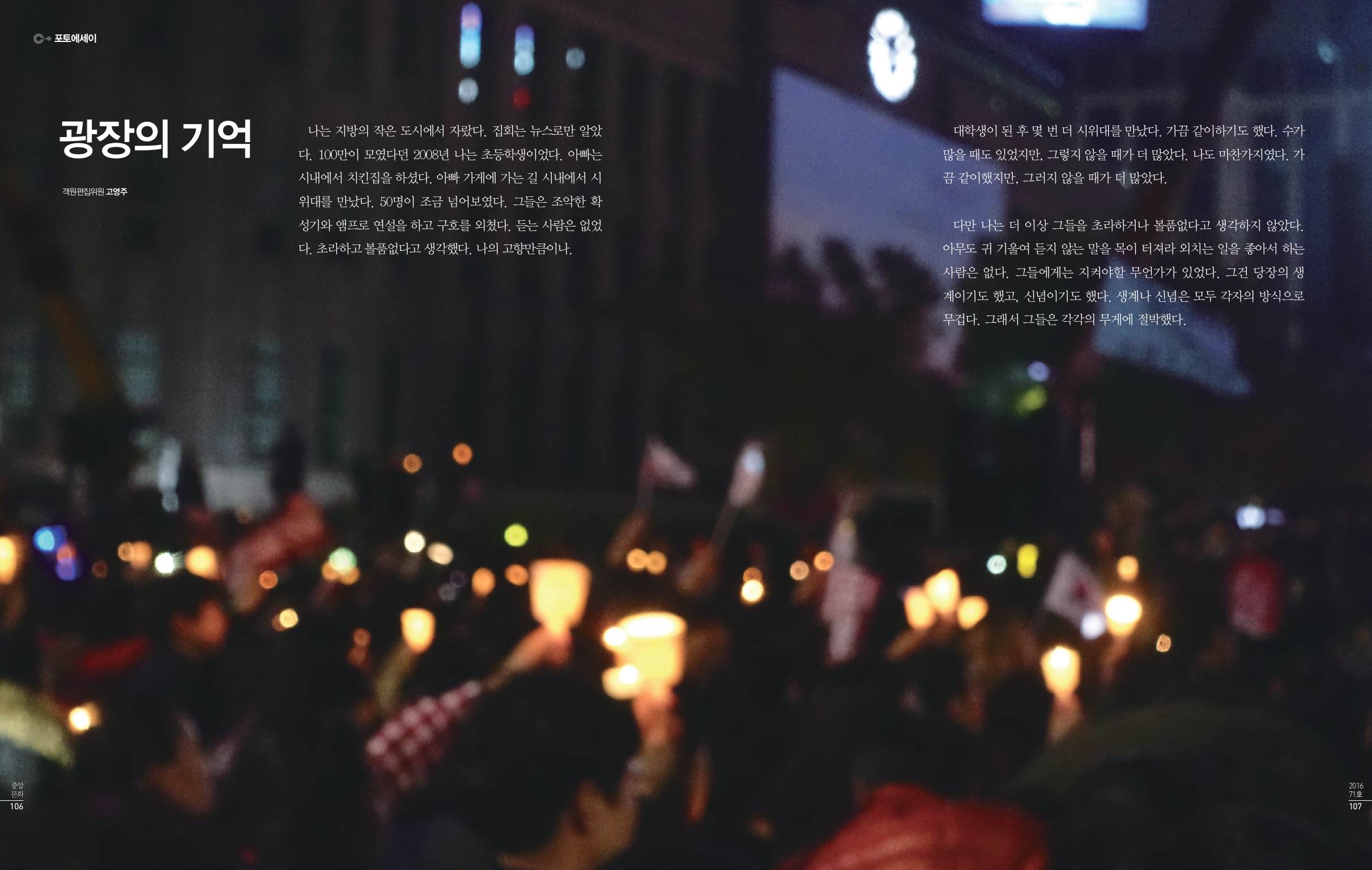 나는 지방의 작은 도시에서 자랐다. 집회는 뉴스로만 알았다. 100만이 모였다던 2008년 나는 초등학생이었다. 아빠는 시내에서 치킨집을 하셨다. 아빠가게에 가는 길 시내에서 시위대를 만났다. 50명이 조금 넘어보였다. 그들은 조악한 확성기와 앰프로 연설을 하고 구호를 외쳤다. 듣는 사람은 없었다. 초라하고 볼품없다고 생각했다. 나의 고향만큼이나.