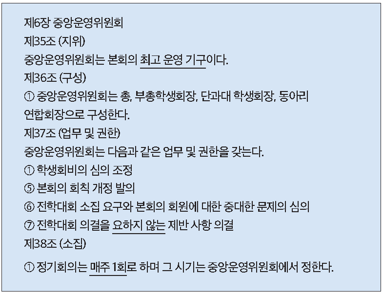 또 다른 기구로는 중앙운영위원회(중운위)가 있다. 중운위는 총·부총학생회장과 단과대 학생회장, 동아리 연합회장으로 구성된 최고 운영 기구다. 회칙에서 의결 기구라고 칭하지 않고 운영 기구라고 칭하는 이유는 중운위가‘전학대회의 의결을 요하지 않는 제반 사항들에 대해 의결’하기 때문이다. 매주 열리는 회의체인 만큼 가장 신속하게 학생들의 의견을 반영할 수 있는 기구다. 중앙대학교의 경우 단과대 학생회장 11명을 포함해 총 14명의 학생대표자들이 의결권을 지닌다. 학생자치가 축소된 학교에도 필수적으로 존재하는 기구이고, 총학생회 사업에 대한 세세한 평가가 이루어지는 곳이다.