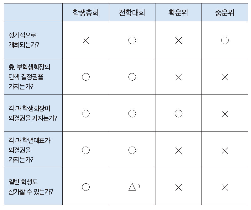 총학생회 회칙을 살펴보면 학생 관련 활동에 관해 의결권을 가지는 기구로는 전체학생총회의(학생총회), 전체학생대표자회의(전학대회), 확대운영위원회(확운위), 중앙운영위원회(중운위)가 있다.