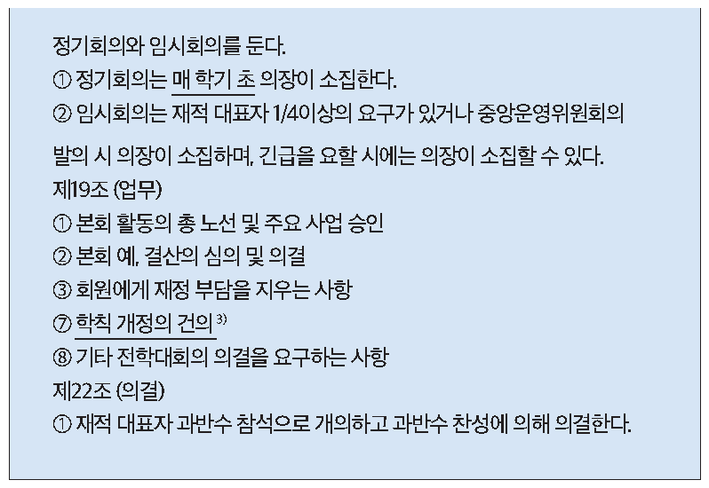 - 전학대회나 학생총회에서 학칙 개정을 이사회에 건의할 수 있다. [본문으로]
