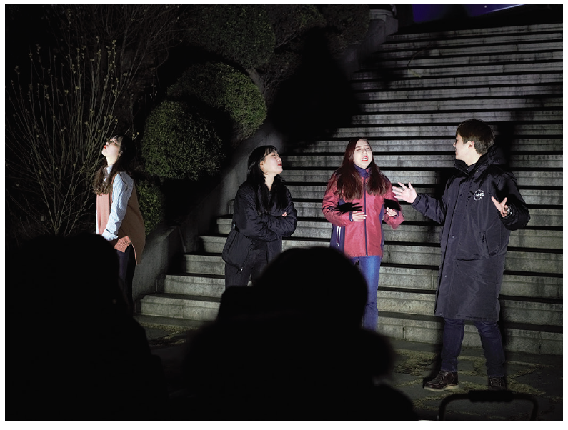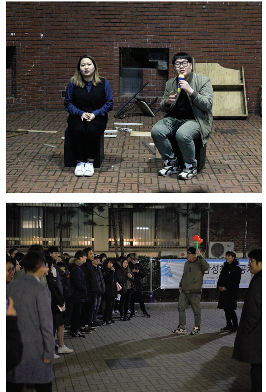장세림(미디어커뮤니케이션 2) 야외극이라서 우리 학교에서 대표되는 공간이라고 생각하는 곳을 선정해서 그곳에서 공연을 올렸어요. 그리고 우리의 메시지를 각 공간에서 잘 전달될 수 있도록 노력했죠. 이번 공연을 계기로 학내 구성원들이 공간 문제에 많은 관심을 가지게 됐으면 좋겠어요.