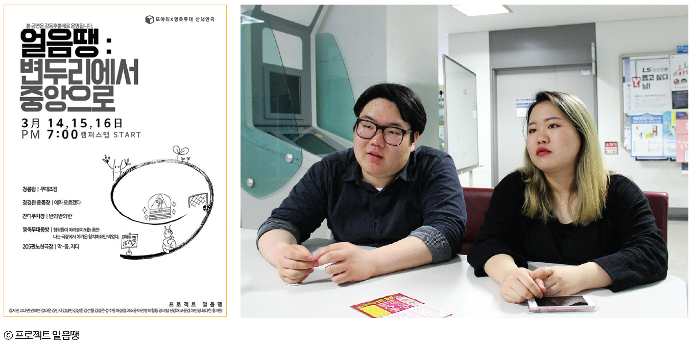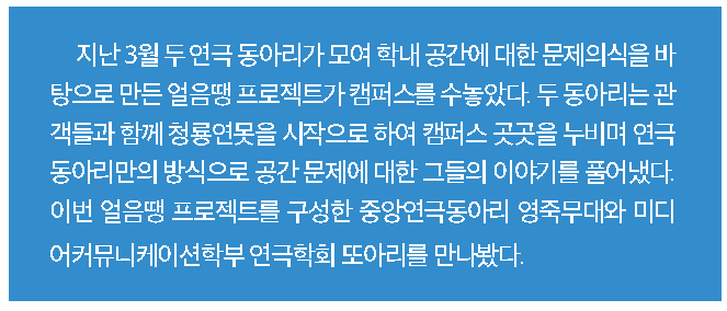 김상훈: 중앙대학교의 공간 문제가 고질적이긴 했는데요, 사실 극장이 없어질 거라는 소식을 듣기 전까지는 잘 몰랐어요. 그러다가 작년 8월쯤에야 알게 됐죠. 일이 갑자기 닥치니 마음이 급해지더라고요. 중앙문화에서 학내 공간 문제와 관련된 기획을 쓴다고 하기에 다짜고짜 찾아가서 인터뷰를 하기도 했어요. 당시 동아리 회장 형을 찾아 가서 인터뷰를 하고 왔다고 했더니 그 형이 “왜 그렇게 성급하게 했냐”고 그러더라고요. “우리는 아무 것도 안 하고 있는 줄 아냐”면서. 그렇게 싸우다가 마지막엔 서로를 부둥켜안고 울었어요. 그 때 형이 참 외로워 보였죠. 연극 동아리 내부 구성원들이 한 명도 외롭지 않고 즐겁게 우리만의 방식으로 싸울 수 있었으면 좋겠다는 생각이 들었어요. 그러다 불현듯 다른 동아리와 연합 공연을 해보겠다고 급조해서 인터뷰했던 게 떠올랐어요. 급조해서 말한 것이긴 했지만 괜찮은 생각이더라고요. 다른 동아리와 이야기해서 합동 공연을 해보자 마음먹었죠. 결국 11월에 미디어커뮤니케이션학부 연극학회인 ‘또아리’에 합동 공연을 제안했고, 영죽무대와 또아리는 함께 얼음땡을 만들고 공연을 하게 됐어요.