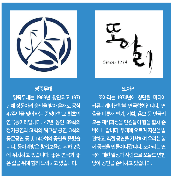 김상훈(사회 3) 안녕하세요. 중앙 연극동아리 영죽무대 회장 김상훈입니다.