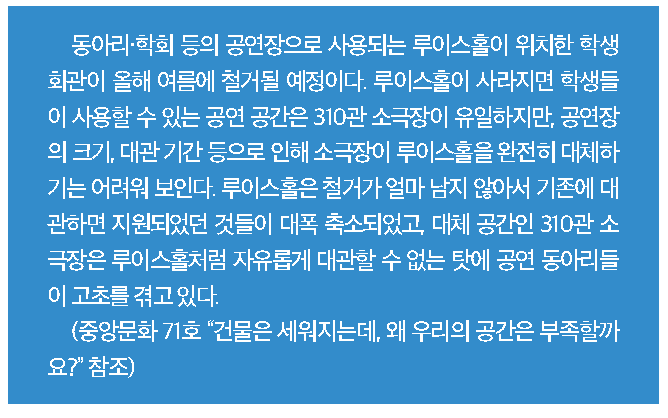 김상훈: 루이스홀은 올해 7월에 철거돼요. 학교는 대체 공간으로 310관에 소극장을 만들긴 했어요. 하지만 대체공간이 생겼다 해도 같은 조건은 아니에요. 루이스홀은 항상 빌릴 수 있었지만, 새로 생긴 소극장은 한 달에 15일밖에 빌리지 못하거든요. 공연을 진행하는 학내 동아리는 많은데 공연을 위한 공간은 그곳 하나라는 건 말이 안 되는 것 같아요