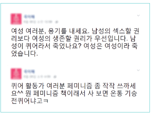 미러링 전략이 전면적으로 등장한 이후 ‘혐오에 혐오로 대응하는 게 옳으냐’라는 비난이야 꾸준히 지속되긴 했지만, 그래도 그 전략이 시스젠더-이성애자-마초 남성을 향한 것이라고 간주되었을 때는 미러링이 어느 정도 전략으로서의 위치를 확보하고 있었다. 이때의 미러링은 발화권력을 지니고 있는 남성들의 언어를 그대로 뒤집어 그 권력을 공격하는 방식으로 이해될 수 있었기 때문이다. 남성들이 이에 대해 ‘남성혐오’라고 비난한들, 체제를 유지하기 위한 시스템의 일환으로서 작동하고 있는 혐오는 엄연히 강력하게 존재하는 성별 권력관계를 뒤집어 성립하지는 않는다. 그러나 그 전략이 특정한 소수자성을 지닌 남성들이나 트랜스/여성 등을 향하면서부터는 이야기가 달라질 수밖에 없다. 이 권력관계에는 장애, 성별정체성, 성적지향, 계급 등의 다양한 문제들이 교차되고 단순히 ‘남성 대 여성’이라는 구도로는 옹호하기 어려운 문제들이 발생하는 것이다. 때문에 ‘똥꼬충’이라든가 ‘씨팔(씹할)’을 대신해 사용되는 ‘후(후장)팔’, ‘병신’ 등의 용어는 단순히 전략적인 미러링의 표현으로 관용되기 어려운 불편함을 만들어낸다. 문제는 이런 표현들에 대한 문제 제기가 단지 ‘정치적 올바름’을 내세운 검열의 문제로만 이해되었다는 것이다. 한쪽에서는 “미러링이 우리 전략인데 왜 ‘옳은 말’만 하라 면서 페미들을 공격하냐!”고 주장하고, 다른 한쪽에서는 소수자 혐오표현 쓰지 말라며 여성비하나 혐오가 담긴 욕을 한다. 이런 경향은 단문으로 빠르게 오가는 트위터에서 더 심하게 벌어졌고, 문제의식을 자세히 이야기하고자 하면 ‘설명충’이나 ‘진지충’, ‘진보꼰대’가 되어버리는 문화 속에서 결국 서로에 대한 공격과 상처만 남았다.